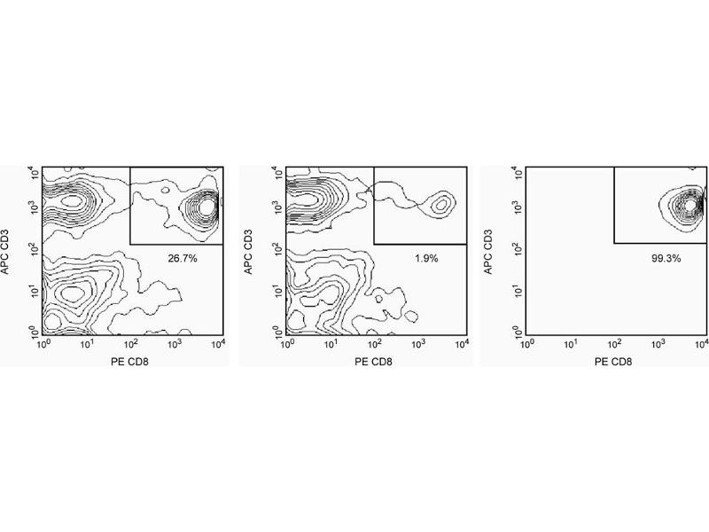 BD IMag™ anti-human CD8 Particles - DM are magnetic nanoparticles that have monoclonal antibody conjugated to their surfaces. These particles are optimized for the positive selection or depletion of CD8-bearing leukocytes using the BD IMagnet™. CD8 is expressed on the peripheral MHC class I-restricted suppressor/cytotoxic T-lymphocyte subset, on a subset of NK cells, and on the majority of thymocytes. The SK1 mAb has been reported to cross-react with lymphocytes of chimpanzee and cynomolgus, pig-tailed, and rhesus macaque. Peripheral Blood Mononuclear Cells (PBMC) are labeled with BD IMag™ Anti-Human CD8 Magnetic Particles - DM according to the Magnetic Labeling Protocol. This labeled cell suspension is then placed within the magnetic field of the BD IMagnet™ (Cat. No. 552311). Labeled cells migrate toward the magnet (positive fraction), leaving the unlabeled cells in suspension so they can be drawn off (negative fraction). The tube is then removed from the magnetic field for resuspension of the positive fraction. The separation is repeated twice to increase the purity of the positive fraction. The magnetic separation steps are diagrammed in the Separation Flow Chart. After the positive fraction is washed, the small size of the magnetic particles allows the positive fraction to be further evaluated in downstream applications such as flow cytometry.
