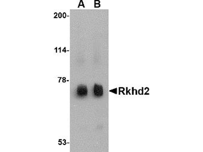 Rkhd2 antibody can be used for detection of Rkhd2 by Western blot at 0.5 - 1 μg/mL.