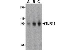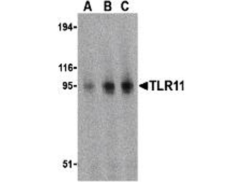 TLR11 antibody polyclonal antibody can be used for detection of TLR11 by Western blot at 0.5 to 2 μg/mL.