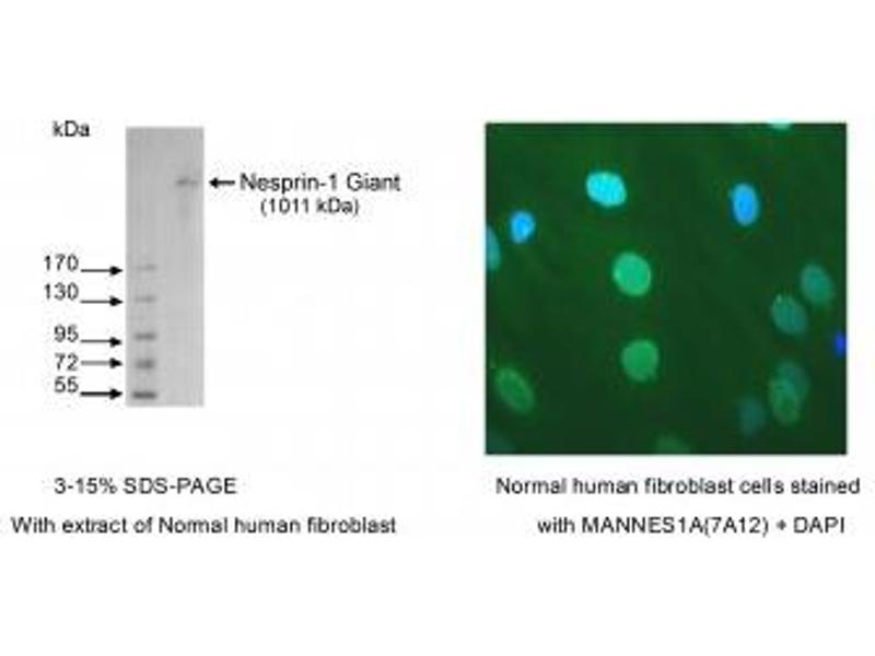 - Recognizes the C-terminal region of nesprin-1-giant