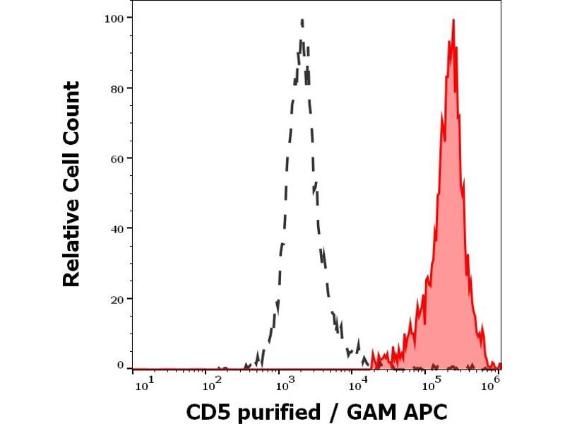 CD5 Molecule,CD5 antigen (T1, 67 kDa) is a human cell surface T-lymphocyte single-chain transmembrane glycoprotein. CD5 is expressed on all mature T-lymphocytes, most of thymocytes, subset of B-lymphocytes and on many T-cell leukemias and lymphomas. It is a type I membrane glycoprotein whose extracellular region contains three scavenger receptor cysteine-rich (SRCR) domains. The CD5 is a signal transducing molecule whose cytoplasmic tail is devoid of any intrinsic catalytic activity. CD5 modulates signaling through the antigen-specific receptor complex (TCR and BCR). CD5 crosslinking induces extracellular Ca++ mobilization, tyrosine phosphorylation of intracellular proteins and DAG production. Preliminary evidence shows protein associations with ZAP-70, p56lck, p59fyn, PC-PLC, etc. CD5 may serve as a dual receptor, giving either stimulatory or inhibitory signals depending both on the cell type and development stage. In thymocytes and B1a cells it seems to provide inhibitory signals, in peripheral mature T lymhocytes it acts as a costimulatory signal receptor. CD5 is the phenotypic marker of a B cell subpopulation involved in the production of autoreactive antibodies. Disease relevance: CD5 is a phenotypic marker for some B cell lymphoproliferative disorders (B-CLL, Hairy cell leukemia, etc.). The CD5+ popuation is expanded in some autoimmune disorders (rheumatoid arthritis, etc.). Herpes virus infections induce loss of CD5 expression in the expanded CD8+ human T cells.,T1, LEU1
