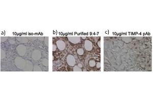 - Anti-TIMP4 was purified from clarified mouse ascetic fluid by Protein A chromatography followed by extensive dialysis against the buffer stated above.