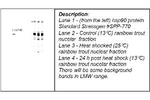in salmonid fish a cross-reactive band at approximately 40 kDa is observed, antibody will also detect a human recombinant HSP90 protein