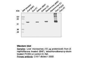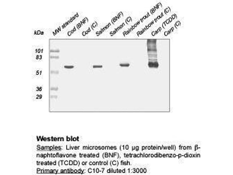 C10-7 cross-reacts with CYP1A in liver samples from carp (Cyprinus carpio), rainbow trout (Oncorhynchus mykiss), salmon (Salmo salar), Atlantic cod (Gadus morhua), turbot (Scophthalmus maximus) lemon sole (Microstomus kitt) and mudfish (Clarias anguillaris). The degree of cross-reactivity differ between species and with the different methods employed.