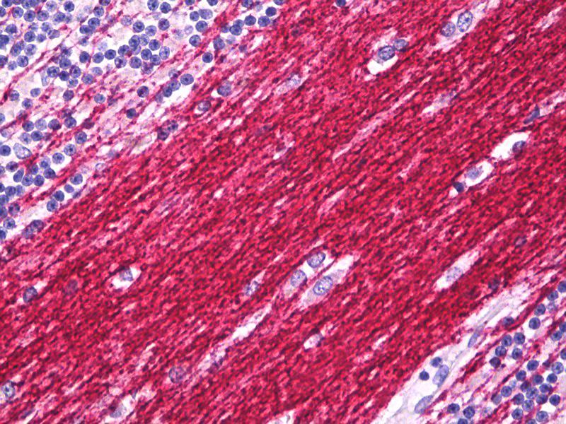 Usage: Suitable for use in Western Blot, Immunocytochemistry and Immunohistochemistry. Western Blot: Can aggregate causing HMW bands to sometimes appear in certain preparations. Immunocytochemistry: 4 % PFA fixed cells for 5-10 minutes at RT. Use 0.1 % triton in block only to allow antibody access to C-terminal epitope. Immunohistochemistry (Frozen): Fresh frozen sections or 4 % PFA fixed, frozen tissues. Epitope is internal, use 0.1-0.2 % triton X-100 in the blocking step for permeabilization. Immunohistochemistry (Paraffin): Works best with lightly fixed tissues, or Bouin's fixed material, although there are reports of traditional formalin fixation also working with antigen recovery. Positive control: Brain. -