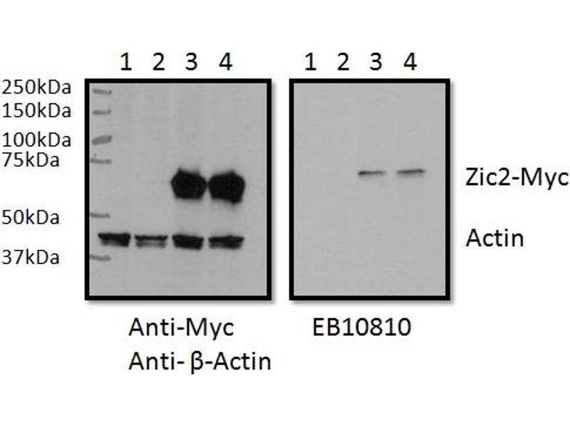 Usage: Peptide ELISA: antibody detection limit dilution 1:1000. Western blot: In transfected RWPE1 transiently expressing Human ZIC2-Myc a band of approx. 65kD is observed. This band is not observed in the non-transfected RWPE1, nor when GFP is transiently expressed. The calculated molecular size is 55.0kD according to NP_009060.2 and 58.6kD for the ZIC2-Myc protein. Data provided by Nathan Bowen and Maryam Boseman, Clark Atlanta University, GA, USA. We have observed an approx 75kD band in Human Brain (Cerebellum and Cerebral Cortex) lysates Recommended concentration, 0.5-2 μg/mL. -