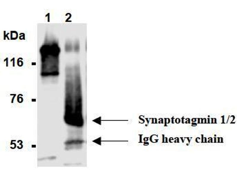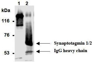 - This antibody reacts with Synaptotagmin 1 and 2 (58 kDa/60 kDa) on Western blotting. Synaptotagmin 1 has a predicted molecular weight of 47 kDa but it migrates at ~65 kDa. It is reported that this clone (1D12) recognizes rat synaptotagmin residues (99-104 aa) in the reference number 17).