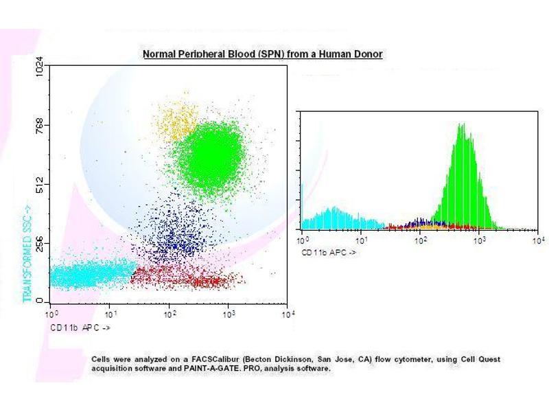 - 1. Transfer 100 µl of anticoagulated (EDTA) blood to a 12 x 75 mm polystyrene test tube (10^6 cells). 2. Add 20 µl of CD11b APC and mix gently with a vortex mixer. The 20 µl is a guideline only, the optimal volume should be determined by the individual laboratory. 3. The recommended negative control is a non-reactive APC-conjugated antibody of the same isotype. 4. Incubate in the dark at room temperature at 4°C for 30 minutes or at room temperature (20-25 °C) for 15 minutes. 5. Add 100 µl of Lysing Solution to each sample and mix gently with a vortex mixer. Incubate for 10 minutes at room temperature in the dark. 6. Centrifuge at 1000 x g for 5 minutes. Gently aspirate the supernatant and discard it leaving approximately 50 µl of fluid. 7. Add 2 ml 0.01 mol/l PBS ( It better that it containing 2% bovine serum albumin) and resuspend the cells by using a vortex mixer. 8. Centrifuge at 1000 x g for 5 minutes. Gently aspirate the supernatant and discard it leaving approximately 50 µl of fluid. 9. Resuspend pellet in an appropriate fluid for flow cytometry, e.g. 0.3 ml PBS. The PBS should contain 1% paraformaldehyde (fixative) if samples are not analysed the same day. 10. Analyse on a flow cytometer or store at 2-8 °C in the dark until analysis. Samples can be run up to 24 hours after lysis. Normal Blood Sample from a Human Donor
