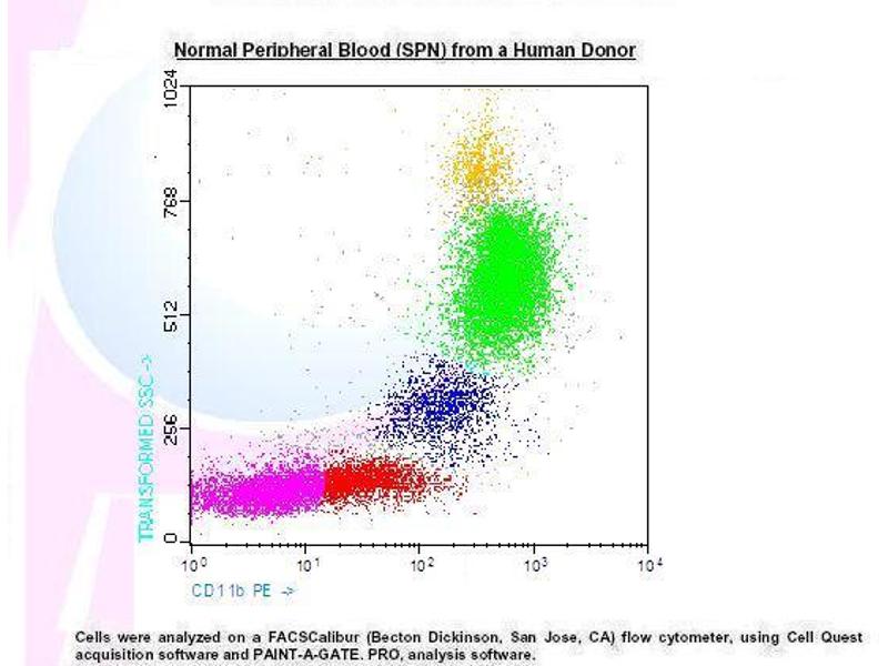 - 1. Transfer 100 µl of anticoagulated (EDTA) blood to a 12 x 75 mm polystyrene test tube (10^6 cells). 2. Add 20 µl of CD11b PE and mix gently with a vortex mixer. The 20 µl is a guideline only, the optimal volume should be determined by the individual laboratory. 3. The recommended negative control is a non-reactive PE-conjugated antibody of the same isotype. 4. Incubate in the dark at room temperature at 4°C for 30 minutes or at room temperature (20-25 °C) for 15 minutes. 5. Add 100 µl of Lysing Solution to each sample and mix gently with a vortex mixer. Incubate for 10 minutes at room temperature in the dark. 6. Centrifuge at 1000 x g for 5 minutes. Gently aspirate the supernatant and discard it leaving approximately 50 µl of fluid. 7. Add 2 ml 0.01 mol/l PBS ( It better that it containing 2% bovine serum albumin) and resuspend the cells by using a vortex mixer. 8. Centrifuge at 1000 x g for 5 minutes. Gently aspirate the supernatant and discard it leaving approximately 50 µl of fluid. 9. Resuspend pellet in an appropriate fluid for flow cytometry, e.g. 0.3 ml PBS. The PBS should contain 1% paraformaldehyde (fixative) if samples are not analysed the same day. 10. Analyse on a flow cytometer or store at 2-8 °C in the dark until analysis. Samples can be run up to 24 hours after lysis. Normal Blood Sample from a Human Donor