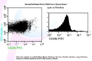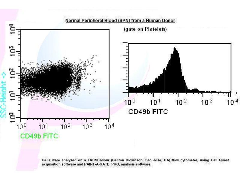 - Transfer 100 µl of anticoagulated (EDTA) blood to a 12 x 75 mm polystyrene test tube (10^6 cells). 2. Add 20 µl of CD49b FITC and mix gently with a vortex mixer. The 20 µl is a guideline only, the optimal volume should be determined by the individual laboratory. 3. The recommended negative control is a non-reactive FITC-conjugated antibody of the same isotype. 4. Incubate in the dark at room temperature at 4°C for 30 minutes or at room temperature (20-25 °C) for 15 minutes. 5. Add 1,5 ml of Lysing Solution to each sample and mix gently with a vortex mixer. Incubate for 10 minutes at room temperature in the dark. 6. Centrifuge at 1000 x g for 5 minutes. Gently aspirate the supernatant and discard it leaving approximately 50 µl of fluid. 7. Add 2 ml 0.01 mol/l PBS (It better that it containing 2% bovine serum albumin) and resuspend the cells by using a vortex mixer. 8. Centrifuge at 1000 x g for 5 minutes. Gently aspirate the supernatant and discard it leaving approximately 50 µl of fluid. 9. Resuspend pellet in an appropriate fluid for flow cytometry, e.g. 0.3 ml PBS. The PBS should contain 1% paraformaldehyde (fixative) if samples are not analysed the same day. 10. Analyse on a flow cytometer or store at 2-8 °C in the dark until analysis. Samples can be run up to 24 hours after lysis.Platelets from a Human Donor