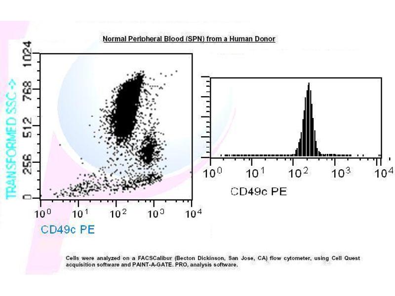 - Transfer 100 µl of anticoagulated (EDTA) blood to a 12 x 75 mm polystyrene test tube (10^6 cells). 2. Add 20 µl of CD49c PE and mix gently with a vortex mixer. The 20 µl is a guideline only, the optimal volume should be determined by the individual laboratory. 3. The recommended negative control is a non-reactive PE-conjugated antibody of the same isotype. 4. Incubate in the dark at room temperature at 4°C for 30 minutes or at room temperature (20-25 °C) for 15 minutes. 5. Add 1,5 ml of Lysing Solution to each sample and mix gently with a vortex mixer. Incubate for 10 minutes at room temperature in the dark. 6. Centrifuge at 1000 x g for 5 minutes. Gently aspirate the supernatant and discard it leaving approximately 50 µl of fluid. 7. Add 2 ml 0.01 mol/l PBS (It better that it containing 2% bovine serum albumin) and resuspend the cells by using a vortex mixer.8. Centrifuge at 1000 x g for 5 minutes. Gently aspirate the supernatant and discard it leaving approximately 50 µl of fluid. 9. Resuspend pellet in an appropriate fluid for flow cytometry, e.g. 0.3 ml PBS. The PBS should contain 1% paraformaldehyde (fixative) if samples are not analysed the same day. 10. Analyse on a flow cytometer or store at 2-8 °C in the dark until analysis. Samples can be run up to 24 hours after lysis.