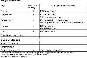 Reacts with nonlymphoid dendritic cells: interdigitating cells (IDC), veiled cells and Langerhans cells, thymic epithelial cells. Monoclonal antibody NLDC-145 identifies Ia positive interdigitating cells, veiled cells and Langerhans cells of the skin and their in vitro counterparts. The antigen is expressed at high levels by dendritic cells and thymic epithelial cells. The antigen detected by NLDC-145 is an integral membrane glycoprotein with an apparent mass of 205 kDa, also known as DEC-205.