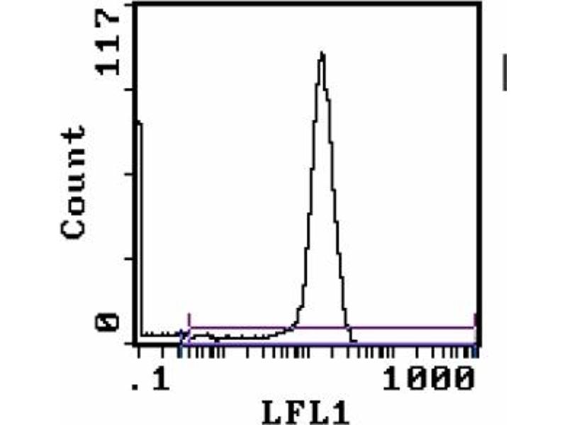 - FLOW CYTOMETRY ANALYSIS: Method: 1. Prepare a cell suspension in media A. For cell preparations, deplete the red blood cellpopulation with Lympholyte®-M cell separation medium. 2. Wash 2 times. 3. Resuspend the cells to a concentration of 2x107 cells/ml in media A. Add 50µl of thissuspension to each tube (each tube will then contain 1 x 106 cells, representing 1 test). 4. To each tube, add 0. 1-0. 5 µg* of ABIN114165 per 106 cells. 5. Vortex the tubes to ensure thorough mixing of antibody and cells. 6. Incubate the tubes for 30 minutes at 4°C. (It is recommended that the tubes are protected from light, since most flurochromes arelight sensitive. )7. Wash 2 times at 4°C. 8. Resuspend the cell pellet in 50 µl ice cold media B. 9. Transfer to suitable tubes for flow cytometric analysis containing 15 µl of propidiumiodide at 0. 5 mg/ml in PBS. This stains dead cells by intercalating in DNA. Media: A. Phosphate buffered saline (pH 7. 2) + 5% normal serum of host species + sodium azide(100 µl of 2M sodium azide in 100 mls). B. Phosphate buffered saline (pH 7. 2) + 0. 5% Bovine serum albumin + sodium azide (100µl of 2M sodium azide in 100 mls).