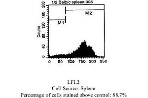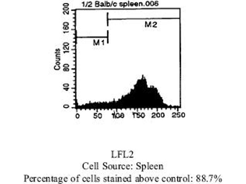 FLOW CYTOMETRY ANALYSIS: Method: 1. Prepare a cell suspension in media A. For cell preparations, deplete the red blood cellpopulation with Lympholyte®-M cell separation medium. 2. Wash 2 times. 3. Resuspend the cells to a concentration of 2x10e7 cells/ml in media A. Add 50 µl of thissuspension to each tube (each tube will then contain 1 x 10e6 cells, representing 1 test). 4. To each tube, add ~0. 25µg* of this Ab per 10e6 cells. 5. Vortex the tubes to ensure thorough mixing of antibody and cells. 6. Incubate the tubes for 30 minutes at 4°C. 7. Wash 2 times at 4°C. 8. Add 100 µl of secondary antibody (Streptavidin-PE) at a 1: 50 dilution. 9. Incubate tubes at 4°C for 30 - 60 minutes (It is recommended that tubes are protectedfrom light since most fluorochromes are light sensitive). 10. Wash 2 times at 4°C. 11. Resuspend the cell pellet in 50 µl ice cold media B. 12. Transfer to suitable tubes for flow cytometric analysis containing 15 µl of propidiumiodide at 0. 5 mg/ml in PBS. This stains dead cells by intercalating in DNA. Media: A. Phosphate buffered saline (pH 7. 2) + 5% normal serum of host species + sodium azide(100 µl of 2M sodium azide in 100 mls). B. Phosphate buffered saline (pH 7. 2) + 0. 5% Bovine serum albumin + sodium azide (100µl of 2M sodium azide in 100 mls). Results - Tissue Distribution: Mouse Strain: BALB/cCell Concentration: 1x10e6 cells per testAntibody Concentration Used: 0. 25 µg/10e6 cellsIsotypic Control: Biotin Rat IgG2b
