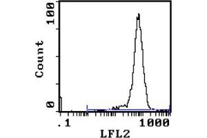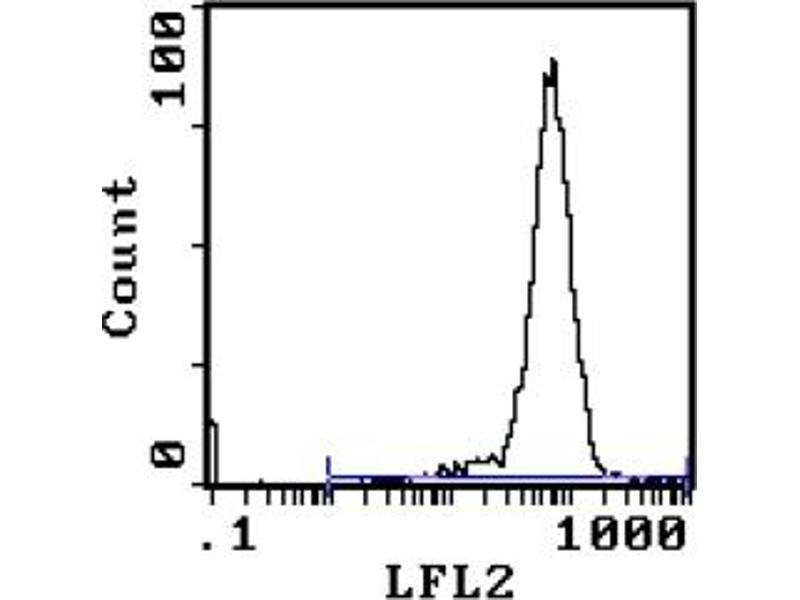 FLOW CYTOMETRY ANALYSIS: Method: 1. Prepare a cell suspension in media A. For cell preparations, deplete the red blood cellpopulation with Lympholyte®-M cell separation medium. 2. Wash 2 times. 3. Resuspend the cells to a concentration of 2x10e7 cells/ml in media A. Add 50 µl of thissuspension to each tube (each tube will then contain 1x10e6 cells, representing 1 test). 4. To each tube, add 0. 5 µg* of this Ab. 5. Vortex the tubes to ensure thorough mixing of antibody and cells. 6. Incubate the tubes for 30 minutes at 4°C. (It is recommended that the tubes areprotected from light, since most fluorochromes are light sensitive. )7. Wash 2 times at 4°C. 8. Resuspend the cell pellet in 50 µl ice cold media B. 9. Transfer to suitable tubes for flow cytometric analysis containing 15 µl of propidiumiodide at 0. 5 mg/ml in PBS. This stains dead cells by intercalating in DNA. Media: A. Phosphate buffered saline (pH 7. 2) + 5% normal serum of host species + sodium azide(100 µl of 2M sodium azide in 100 mls). B. Phosphate buffered saline (pH 7. 2) + 0. 5% Bovine serum albumin + sodium azide (100µl of 2M sodium azide in 100 mls). Results - Tissue Distribution: Mouse Strain: BALB/cCell Concentration: 1x10e6 cells per testAntibody Concentration Used: 0. 5 µg/10e6 cellsIsotypic Control: PE-Mouse IgG2b,kCell Source Percentage of cells stained above control: Thymus: 98. 4%Spleen: 28. 8%Results - Strain Distribution: Cell Concentration: 1x10e6 cells per testAntibody Concentration Used: 0. 5 µg/10e6 cellsStrains Tested: C57BL/6, C3H/He, CBA/J, BALB/c, ATL, AKR/JPositive: C57BL/6, C3H/He, CBA/J, BALB/c, ATLNegative: AKR/J