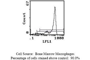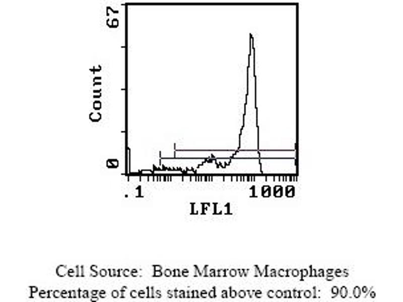 - FLOW CYTOMETRY ANALYSIS: Method: 1. Prepare a cell suspension in media A. For cell preparations, deplete the red blood cellpopulation. 2. Wash 2 times. 3. Resuspend the cells to a concentration of 2x10e7 cells/ml in media A. Add 50 µl of thissuspension to each tube (each tube will then contain 1 x 10e6 cells, representing 1 test). 4. To each tube, add 0. 1 - 0. 5 µg of antibody per 10e6 cells. 5. Vortex the tubes to ensure thorough mixing of antibody and cells. 6. Incubate the tubes for 30 minutes at 4°C. (It is recommended that the tubes areprotected from light, since most fluorochromes are light sensitive. )7. Wash 2 times at 4°C. 8. Resuspend the cell pellet in 50 µl ice cold media B. 9. Transfer to suitable tubes for flow cytometric analysis containing 15 µl of propidiumiodide at 0. 5 mg/ml in PBS. This stains dead cells by intercalating in DNA. Media: A. Phosphate buffered saline (pH 7. 2) + 5% normal serum of host species + sodium azide(100 µl of 2M sodium azide in 100 mls). B. Phosphate buffered saline (pH 7. 2) + 0. 5% Bovine serum albumin + sodium azide (100µl of 2M sodium azide in 100 mls). Results: Tissue Distribution by Flow Cytometry Analysis: Mouse Strain: CBA/JCell Concentration : 1x10e6 cells per testAntibody Concentration Used: 0. 1 µg/10e6 cellsIsotypic Control: FITC Rat IgG2bCell Source Percentage of cells stained above control: Thymus 1. 5%Whole Blood Monocytes 87. 2%Bone Marrow Macrophages 90. 0%(see picture below)Strain Distribution by Flow Cytometry Analysis: Procedure: see aboveCell Concentration: 1x10e6 cells per test
