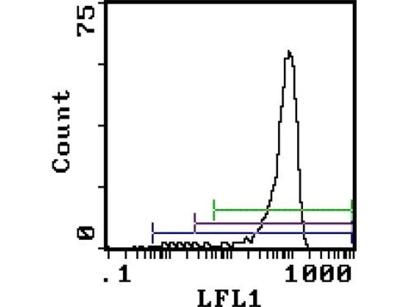 - FLOW CYTOMETRY ANALYSIS: Method: 1. Prepare a cell suspension in media A. For cell preparations, deplete the red blood cellpopulation with cell separation medium. 2. Wash 2 times. 3. Resuspend the cells to a concentration of 2x10e7 cells/ml in media A. Add 50 µl of thissuspension to each tube (each tube will then contain 1 x 10e6 cells, representing 1 test). 4. To each tube, add 0. 1-0. 2 µg* of ABIN114273. 5. Vortex the tubes to ensure thorough mixing of antibody and cells. 6. Incubate the tubes for 30 minutes at 4°C. 7. Wash 2 times at 4°C. 8. Add 100 µl of secondary antibody FITC Goat anti-rat IgG (H+L) . 9. Incubate tubes at 4°C for 30 - 60 minutes (It is recommended that tubes are protectedfrom light since most fluorochromes are light sensitive). 10. Wash 2 times at 4°C. 11. Resuspend the cell pellet in 50 µl ice cold media B. 12. Transfer to suitable tubes for flow cytometric analysis containing 15 µl of propidiumiodide at 0. 5 mg/ml in PBS. This stains dead cells by intercalating in DNA. Media: A. Phosphate buffered saline (pH 7. 2) + 5% normal serum of host species + sodium azide(100 µl of 2M sodium azide in 100 mls). B. Phosphate buffered saline (pH 7. 2) + 0. 5% Bovine serum albumin + sodium azide (100µl of 2M sodium azide in 100 mls). Results-Tissue Distribution: Mouse Strain: BALB/cCell Concentration: 1x10e6 cells per testAntibody Concentration Used: 0. 1 µg/10e6 cellsIsotypic Control: Rat IgG2bCell Source-Percentage of cells stained above control: Thymus: 2. 0%Whole Blood Monocytes: 79. 1%Bone Marrow Macrophages: 87. 5%N. B. Appropriate control samples should always be included in any labelling studies. * For optimal results in various applications, it is recommended that each investigatordetermine dilutions appropriate for individual use. Strain Distribution by Flow Cytometry Analysis: Cell Concentration: 1x10e6 cells per testAntibody Concentration Used: 0. 1 µg/10e6 cellsStrains Tested: BALB/c, C57BL/6, CBA, C3H/He, AKR