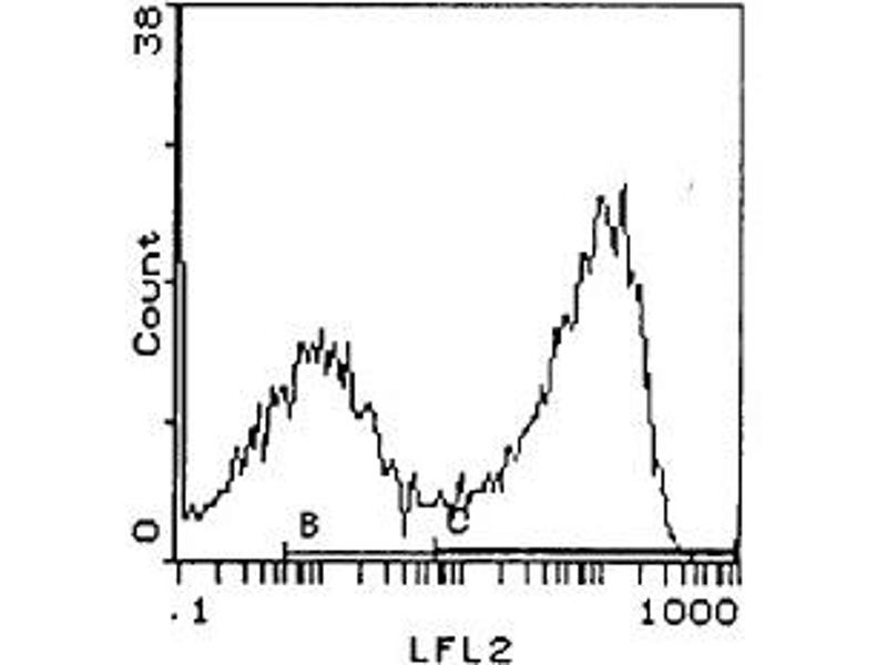 FLOW CYTOMETRY ANALYSIS: Method: 1. Prepare a cell suspension in media A. For cell preparations, deplete the red blood cellpopulation. 2. Wash 2 times. 3. Resuspend the cells to a concentration of 2x10e7 cells/ml in media A. Add 50 μl of thissuspension to each tube (each tube will then contain 1 x 10e6 cells, representing 1 test). 4. To each tube, add 0. 2 - 0. 1 μg of ABIN114360 per 10e6 cells. 5. Vortex the tubes to ensure thorough mixing of antibody and cells. 6. Incubate the tubes for 30 minutes at 4°C. (It is recommended that the tubes are protected from light, since most fluorochromes arelight sensitive. )7. Wash 2 times at 4°C. 8. Resuspend the cell pellet in 50 μl ice cold media B. 9. Transfer to suitable tubes for flow cytometric analysis containing 15 μl ofepropidiumiodide at 0. 5 mg/ml in PBS. This stains dead cells by intercalating in DNA.
