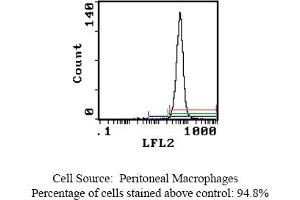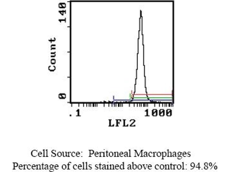 FLOW CYTOMETRY ANALYSIS: Method: 1. Prepare a cell suspension in media A. For cell preparations, deplete the red blood cellpopulation with Lympholyte®-Rat cell separation medium. 2. Wash 2 times. 3. Resuspend the cells to a concentration of 2x10e7 cells/ml in media A. Add 50 µl of thissuspension to each tube (each tube will then contain 1x10e6 cells, representing 1 test). 4. To each tube, add 0. 5-1. 0 µg* of this Ab. 5. Vortex the tubes to ensure thorough mixing of antibody and cells. 6. Incubate the tubes for 30 minutes at 4°C. 7. Wash 2 times at 4°C. 8. Add 5 µl (1 µg) of secondary antibody (PE Goat anti-mouse F(ab1)2 IgG (H+L)) to eachtube. 9. Incubate the tubes at 4°C for 30-60 minutes. (It is recommended that the tubes areprotected from light since most fluorochromes are light sensitive). 10. Wash 2 times at 4°C in media B. 11. Resuspend the cell pellet in 50 µl ice cold media B. 12. Transfer to suitable tubes for flow cytometric analysis containing 15 µl of propidiumiodide at 0. 5 mg/ml in PBS. This stains dead cells by intercalating in DNA. Media: A. Phosphate buffered saline (pH 7. 2) + 5% normal serum of host species + sodium azide(100 µl of 2M sodium azide in 100 mls). B. Phosphate buffered saline (pH 7. 2) + 0. 5% Bovine serum albumin + sodium azide (100µl of 2M sodium azide in 100 mls). Results - Tissue Distribution: Rat Strain: LewisCell Concentration: 1x10e6 cells per testAntibody Concentration Used: 1. 0 µg/10e6 cellsIsotypic Control: Purified Mouse IgG1,kCell Source Percentage of cells stained above control: Thymus: 1. 12%Peritoneal Macrophages: 94. 8%Results - Strain Distribution: Antibody Concentration: 1. 0 µg/10e6 cellsStrains Tested: Wistar, Brown Norway, Buffalo, Fischer 344Positive: Buffalo, Brown Norway, Fischer 344, WistarNegative: none