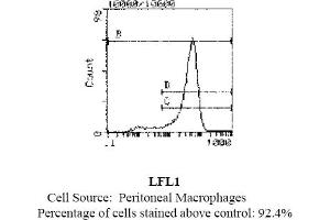 FLOW CYTOMETRY ANALYSIS: Method: 1. Prepare a cell suspension in media A. For cell preparations, deplete the red blood cellpopulation with Lympholyte®-Rat cell separation medium. 2. Wash 2 times. 3. Resuspend the cells to a concentration of 2x10e7 cells/ml in media A. Add 50µl of thissuspension to each tube (each tube will then contain 1 x 10e6 cells, representing 1 test). 4. To each tube, add 0. 2-0. 5 µg* of this Ab. 5. Vortex the tubes to ensure thorough mixing of antibody and cells. 6. Incubate the tubes for 30 minutes at 4°C. (It is recommended that the tubes areprotected from light, since most fluorochromes are light sensitive. )7. Wash 2 times at 4°C. 8. Resuspend the cell pellet in 50 µl ice cold media B. 9. Transfer to suitable tubes for flow cytometric analysis containing 15 µl of propidiumiodide at 0. 5 mg/ml in PBS. This stains dead cells by intercalating in DNA. Media: A. Phosphate buffered saline (pH 7. 2) + 5% normal serum of host species + sodium azide(100 µl of 2M sodium azide in 100 mls). B. Phosphate buffered saline (pH 7. 2) + 0. 5% Bovine serum albumin + sodium azide (100µl of 2M sodium azide in 100 mls). Results - Tissue Distribution: Rat Strain: FischerCell Concentration: 1x10e6 cells per testAntibody Concentration Used: 0. 5 µg/10e6 cellsIsotypic Control: FITC Mouse IgG1,kCell Source Percentage of cells stained above control: Thymus: 3. 0%Peritoneal Macrophages: 92. 4%Results - Strain Distribution: Antibody Concentration Used: 0. 5 mg/10e6 cellsStrains Tested: Wistar, Brown Norway, Buffalo, Fischer 344Positive: Buffalo, Brown Norway, Fischer 344, WistarNegative: none