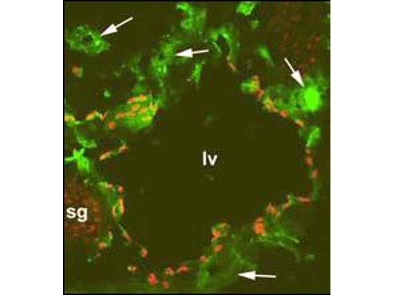 Prox-1 is a homeobox gene and acts as a master switch for lymphatic endothelial phenotype. Expression of Prox-1 in blood endothelial cells induces expression of other lymphatic marker genes. Together with Podoplanin, Prox-1 can be used to reliably distinguish lympathic vessels from blood vessels. Prox1 is expressed in CNS, eye, pancreas, liver and heart, and it is one of the most specific and reliable markers for lymphatic endothelial cells.Synonyms: Homeobox prospero-like protein PROX1, PROX1, Prospero homeobox protein 1