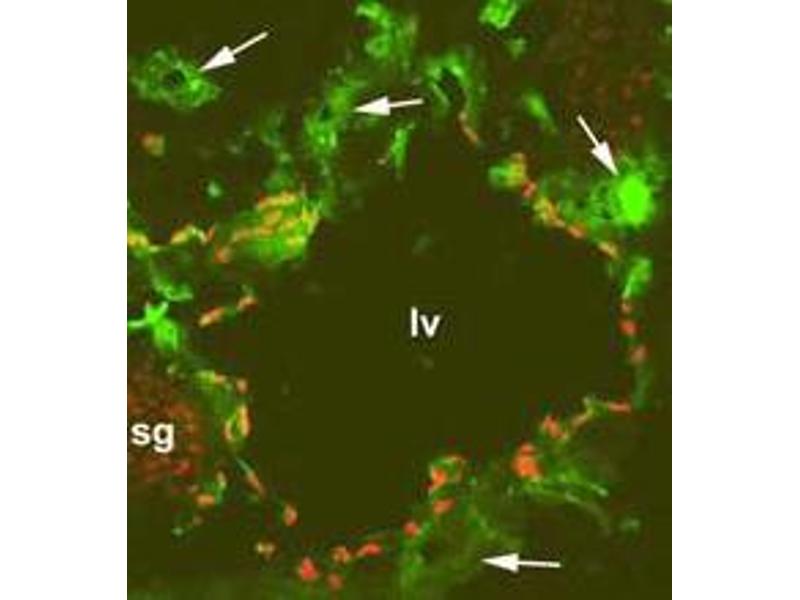 Prox-1 is a homeobox gene and acts as a master switch for lymphatic endothelial phenotype. Expression of Prox-1 in blood endothelial cells induces expression of other lymphatic marker genes. Together with Podoplanin, Prox-1 can be used to reliably distinguish lymphatic vessels from blood vessels. Prox-1 is expressed in CNS, eye, pancreas, liver and heart, and it is one of the most specific and reliable markers for lymphatic endothelial cells.Synonyms: Homeobox prospero-like protein PROX1, PROX1, Prospero homeobox protein 1