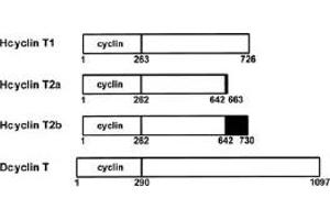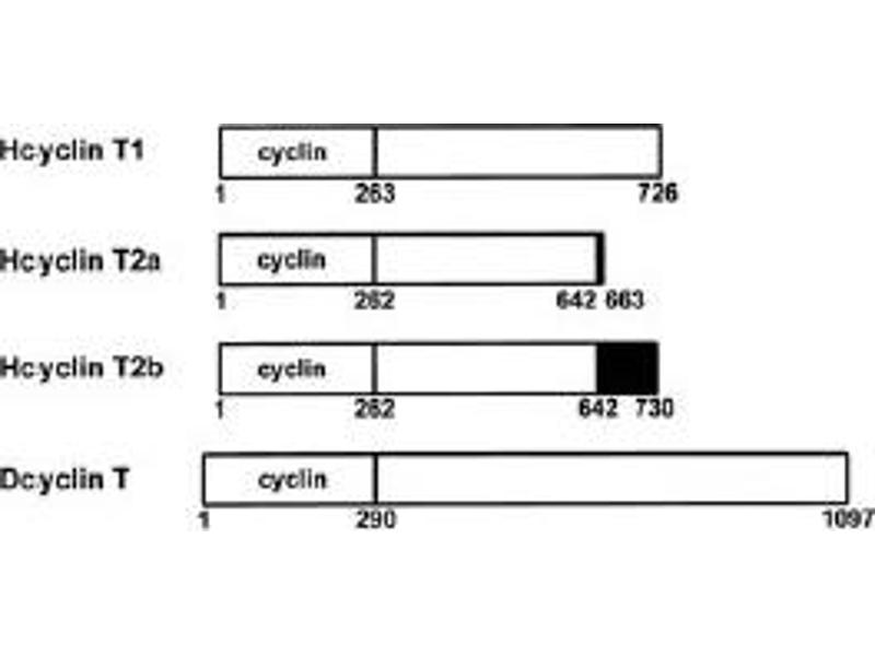 Cyclin T1, together with the kinase CDK9, is a component of the transcription elongation factor P-TEFb which binds the human immunodeficiency virus type 1 (HIV-1) transactivator Tat. Tat stimulates human HIV-1 viral transcription elongation. This suggests that cyclin T1/cdk9(PITALRE) is one of the HIV-1 required host cellular cofactors generated during T cell activation. Cyclin T1/cdk9(PITALRE) is shown to interact with Tat to restore Tat activation in HeLa nuclear extracts depleted of P-TEFb. P-TEFb facilitates transcription by phosphorylating the carboxy-terminal domain (CTD) of RNA polymerase II. The cdk9(PITALRE) activity and cyclin T1 are essential for activation of transcription when tethered to the heterologous Rev response element RNA via the regulator of expression of virion Rev. Cyclin T1 is an exceptionally large cyclin and is therefore a candidate for interactions with regulatory proteins.Synonyms: CCNT1, CycT1, Cyclin-T, Cyclin-T1