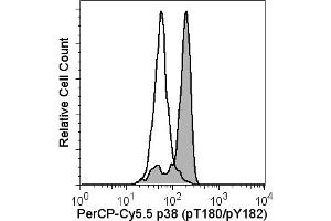 Activation of the immune and inflammatory responses often involves the recognition of bacterial endotoxin (lipopolysaccharide or LPS). Binding of LPS by monocytes results in the production and release of proinflammatory cytokines, such as IL-1 and TNF. LPS-induced signaling cascades involve members of the Ser/Thr protein kinase family known as the Mitogen Activated Protein Kinases (MAPKs). MAPK signal transduction pathways mediate the effects of various extracellular stimuli on biological processes such as proliferation, differentiation, and death. The p38 MAPKs include p38alpha (MAPK14), beta (MAPK11), gamma (MAPK12), and delta (MAPK13). These Ser/Thr kinases are activated by dual phosphorylation on threonine (T) and tyrosine (Y) within the motif Thr-Gly-Tyr located in kinase subdomain VIII. Activation of p38 MAPK is mediated specifically by the MAP Kinase Kinases, MKK3, MKK4, and MKK6. This leads to the activation of multiple transcription factors (NF-kappaB, ATF-2, Elk-1, and CHOP) that induce expression of many different genes, including proinflammatory cytokine genes. Thus, p38 MAPKs are central kinases in multiple signal transduction pathways. The 36/p38 (pT180/pY182) monoclonal antibody recognizes the conserved dual phosphorylated site pT180/pY182 of p38alpha, beta, gamma, and delta. Synonyms: MK14, 11, 12, 13, CSBP1, SAPK2, 2A, 3, 4, MX12, ERK-6, ERK5
