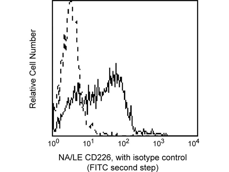 Reacts with DNAX accessory molecule-1 (DNAM-1), a 65 kDa transmembrane glycoprotein consisting of 318 amino acid residues including two Ig-like domains. DNAM-1 is expressed on the majority of T cells, NK cells, monocytes, and a subset of B cells, but not on granulocytes or erythrocytes. It is also present on a subset of thymocytes coexpressing high density surface CD3. DNAM-1 is not present on normal fibroblast cell lines or tumor cell lines of epithelial or neuronal origins. DNAM-1 is a tyrosinephosphorylated, signal-transducing molecule which participates in primary adhesion during cytotoxic T lymphocyte (CTL)-mediated cytotoxicity. DX11 inhibits T- and NKcell-mediated cytotoxicity against a variety of tumor cell targets, and blocks cytokine production by alloantigen-specific T cells. Synonyms: DNAM-1