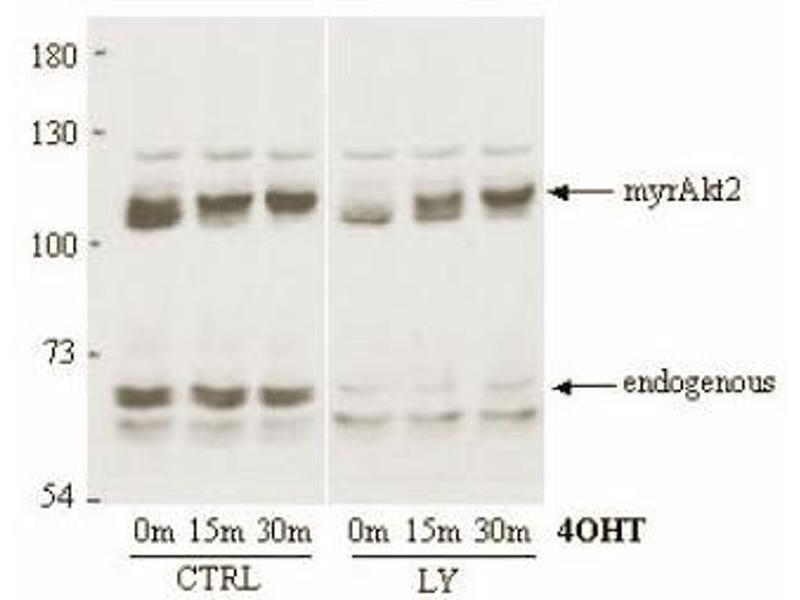 - This antibody was tested by ELISA and Immunoblotting and was found to be reactive withboth unphosphorylated and phosphorylated AKT2 in a lysate of HEK293 cells. Although nottested, this antibody is likely functional in Immunohistochemistry andImmunoprecipitation. Recommended Dilution(s): This product has been assayed by immunoblot against aHEK293 cell lysate and is reactive at a 1: 1,000 dilution showing a band at approximately 60