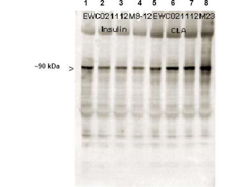 This phospho specific polyclonal antibody was tested by Immunoblotting and ELISA. By ELISA the antibody was found to be reactive with the phosphorylated form of theimmunizing peptide and minimally reactive with the non-phosphorylated form of theimmunizing peptide. Immunoblotting will detect human and mouse muscle glycogensynthase. Although not tested, this antibody is likely functional in Immunohistochemistryand Immunoprecipitation. This product has been assayed against 0.1 g of phosphorylatedpeptide in a standard capture ELISA using TMB (3,3',5,5'-Tetramethylbenizidine) as asubstrate for 30 minutes at room temperature. A working dilution of 1: 30,000 to 1: 150,000is suggested for this product. Less than 0.2 % cross-reactivity was detected against thenon-phosphorylated form o f the immunizing peptide. Dilute the antibody 1: 1,000 for