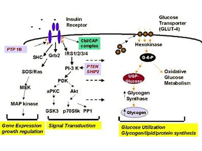 Human muscle glycogen synthase (GS) is responsible for the biosynthesis of glycogen from phosphorylated glucose units. Mammalian liver and muscle contain GS consisting of four subunits with a total molecular weight of 360,000. GS is subject to regulation through both allosteric and covalent modification and occurs in two forms: the phosphorylated inactive form, and the dephosphorylated active form. GS is inactivated by the serine/threonine kinase called glycogen synthase kinase-3β that mainly functions to phosphorylate muscle glycogen synthase. This antibody is specific for the phosphorylated form of GS at S640. Phosphorylation of GS at S640 has been associated with Antiphospholipid Antibody Syndrome.Synonyms: GYS, GYS1, muscle Glycogen Synthase