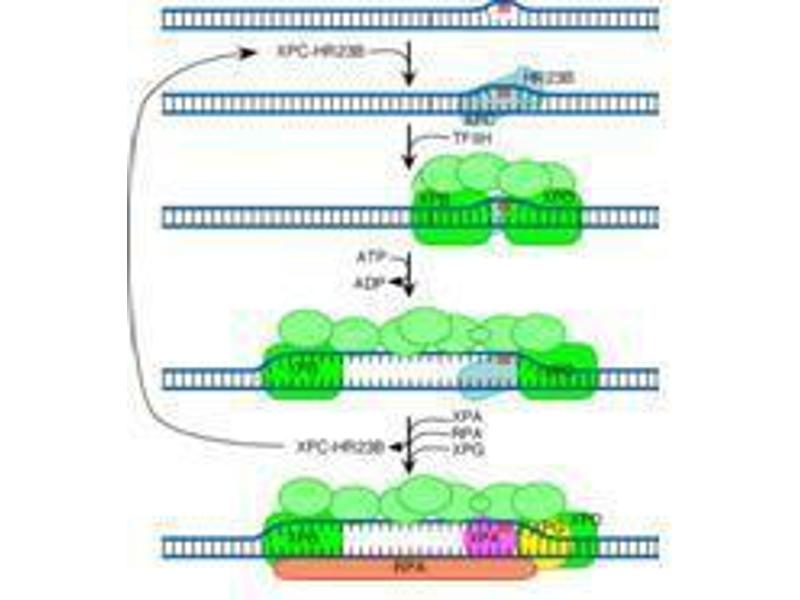 - Background: HR23B (also known as UV excision repair protein RAD23 homolog B, XP-C repair complementing complex 58 kDa protein and p58) is one of two human homologs of Saccharomyces cerevisiae Rad23 (hHR23A and hHR23B), a protein involved in nucleotide excision repair (NER). This protein was shown to interact with, and elevate the nucleotide excision activity of 3-methyladenine-DNA glycosylase (MPG), which suggested a role in DNA damage recognition in base excision repair. This protein contains an N-terminal ubiquitin-like domain, which was reported to interact with 26S proteasome, as well as with ubiquitin protein ligase E6AP, and thus suggests that this protein may be involved in the ubiquitin mediated proteolytic pathway in cells.