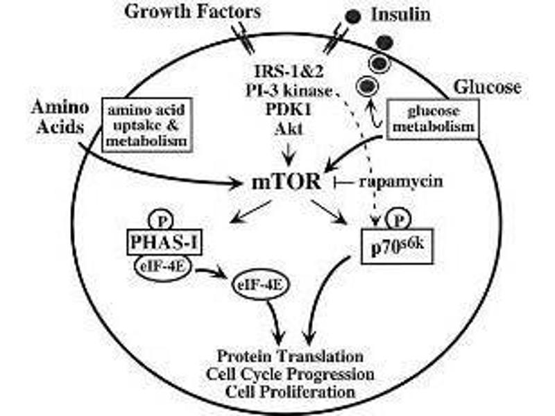 - Background: Mammalian target of rapamycin (mTOR) is a serine and threonine protein kinase that regulates numerous cellular functions, in particular, the initiation of protein translation. Rapamycin is a natural product macrolide that induces G1 growth arrest in yeast, Drosophila, and mammalian cells. mTOR has a long list of synonyms including FK506 binding protein12 - rapamycin associated protein 1, FK506 binding protein12 - rapamycin associated protein 2, FRAP1, FRAP2, RAFT1, RAPT1 and/or FKBP12-rapamycin associated protein (FRAP). mTOR is one of a family of proteins involved in cell cycle progression, DNA recombination, and DNA damage detection. In rat, mTOR is a 245-kD protein referred to as RAFT1 with significant homology to the Saccharomyces cerevisiae protein TOR1 and has been shown to associate with the immunophilin FKBP12 in a rapamycin-dependent fashion. The FKBP12-rapamycin complex is known to inhibit progression through the G1 cell cycle stage by interfering with mitogenic signaling pathways involved in G1 progression in several cell types, as well as in yeast. The binding of mTOR to FKBP12-rapamycin correlates with the ability of these ligands to inhibit cell cycle progression.
