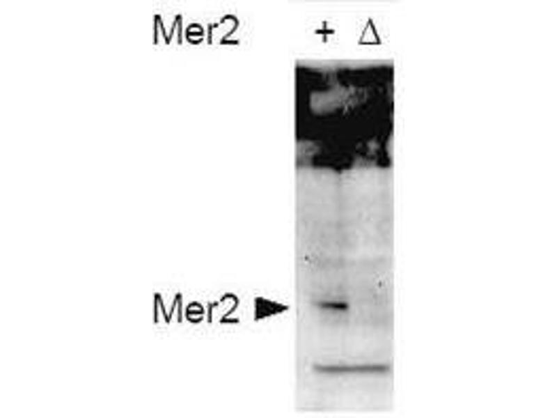 Immunogen: This affinity purified antibody was prepared from whole rabbit serum produced by repeated immunizations with a synthetic peptide corresponding to amino acids 26-35 of Saccharomyces cerevisiae Mer2 protein.