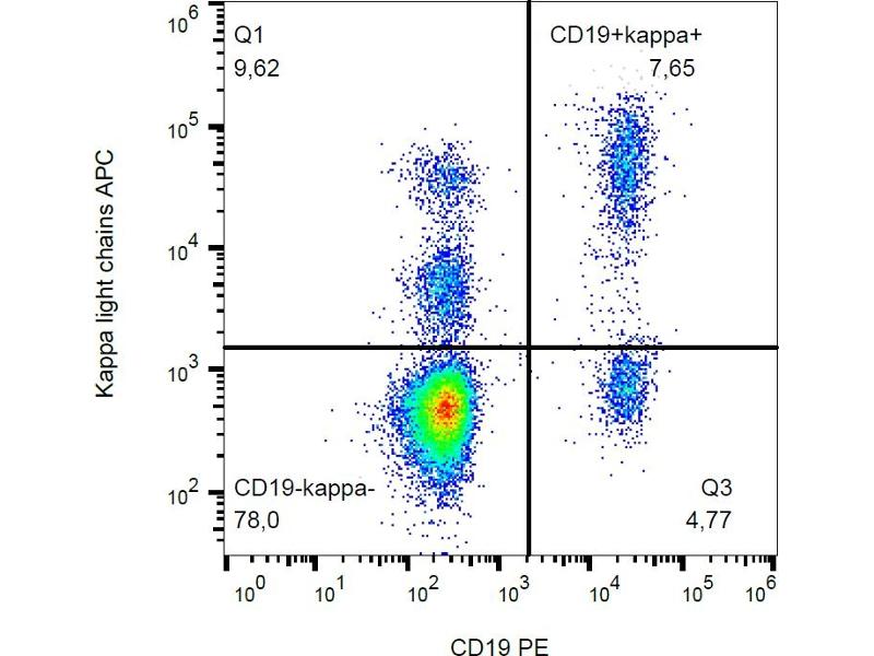 The antibody TB28-2 recognizes human Ig kappa light chains of both secreted and cell surface immunoglobulin. It detects also free kappa light chains.