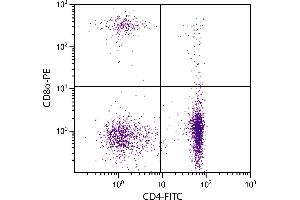 CD8 In the chicken, the CD8 molecule is present in two forms: (i) a homodimer of two chains, and (ii) a heterodimer of an chain and a chain. While the vast majority of CD8+ cells in the thymus, spleen, and blood of adult chickens express both CD8- and CD8-chains, a relatively large proportion of the CD8+ TCR- cells in the spleens of embryos and young chicks express only the -chain of CD8. Among intestinal epithelial lymphocytes, the major CD8+ T cell populations present in mice are conserved, but there is a population of TCR- CD8 cells in the chicken that is not found in rodents. Chicken CD8 is expressed on approximately 80 % of thymocytes, 15 % of blood mononuclear cells and 50 % of spleen cells, but < 1 % of cells in the bursa and bone marrow.