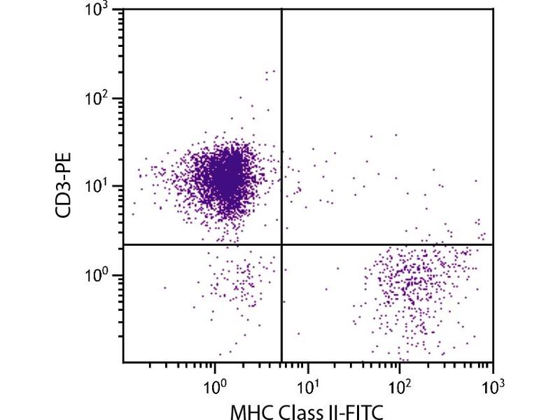 The chicken major histocompatibility complex (MHC), or B complex, consists of several clusters of highly polymorphic genes. Like their mammalian counterparts, the avian MHC exerts genetic influence over a variety of important biological functions such as immune response, disease resistance, growth and development, aging, and reproduction. Chicken MHC Class II genes, also known as the B-L subregion, of the chicken MHC encode cell surface glycoproteins that are homologous to mammalian Class II antigens. B-L antigens structurally are similar to mammalian Class II molecules in that they are noncovalently bound dimmers of one 32-34 kDa heavy chain and one 27-30 kDa light chain. MHC Class II is primarily expressed on B cells and antigen presenting cells (APCs).