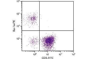 Chicken Bu-1a, a product of the Bu-1a allele, is expressed on the cell surface as a disulfide-linked homodimer. In 10-week-old H.B15 and H.B2 chickens, Bu-1 is found on 85-90 % of bursal cells, 2-8 % of thymocytes, 15-27 % of spleen cells, and 2-18 % of peripheral blood cells. It is also expressed on subsets of macrophages and monocytes, but not on granulocytes, erythrocytes or thrombocytes. In chickens heterozygous for the Bu-1 alleles (Bu-1a/b), Bu-1a does not exhibit allelic exclusion.