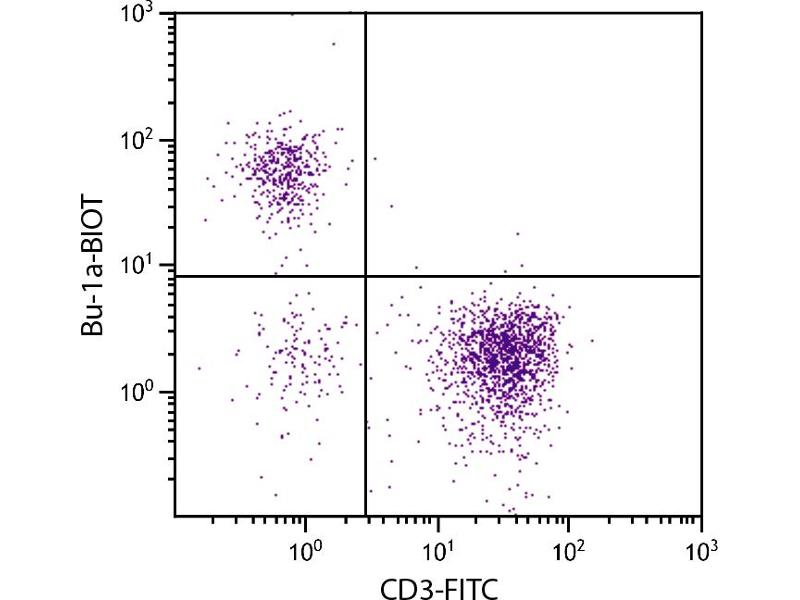 Chicken Bu-1a, a product of the Bu-1a allele, is expressed on the cell surface as a disulfide-linked homodimer. In 10-week-old H.B15 and H.B2 chickens, Bu-1 is found on 85-90 % of bursal cells, 2-8 % of thymocytes, 15-27 % of spleen cells, and 2-18 % of peripheral blood cells. It is also expressed on subsets of macrophages and monocytes, but not on granulocytes, erythrocytes or thrombocytes. In chickens heterozygous for the Bu-1 alleles (Bu-1a/b), Bu-1a does not exhibit allelic exclusion.