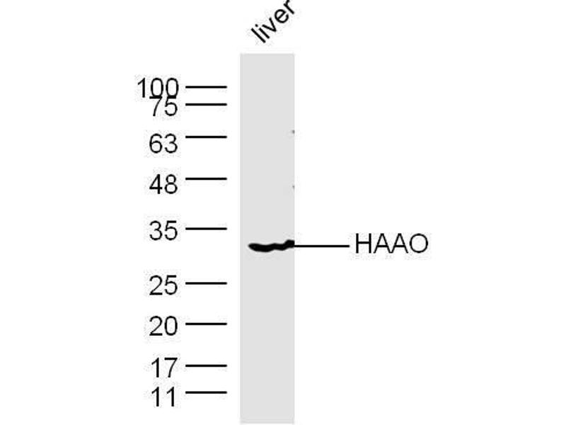 Background: The 3-HAO family of proteins consists of intramolecular dioxygenases that contain non-heme ferrous iron. HAAO (3-hydroxyanthranilate 3,4-dioxygenase), also known as HAO or 3-HAO, is a 286 amino acid monomeric cytoplasmic protein that belongs to the 3-HAO family. Utilizing Fe2+ ions as a cofactor, HAAO participates in the formation of quinolinic acid (QUIN), and excitotoxin, by catalyzing the oxidative ring opening of 3-hydroxyanthranilate to 2-amino-3-carboxymuconate semialdehyde. HAAO may play a role in disorders that are associated with varying levels of QUIN expression, and is widely expressed in peripheral organs, including kidney and liver. Existing as two alternatively spliced isoforms, the gene encoding HAAO maps to human chromosome 2p21 and mouse chromosome 17 E4.