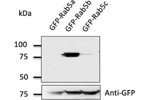 - Detects Rab5b protein by Western blot in cell lysates of transfected cells with GFP-Rab5b. This Ab is specific for Rab5b, it does not recognize Rab5a and Rab5c.