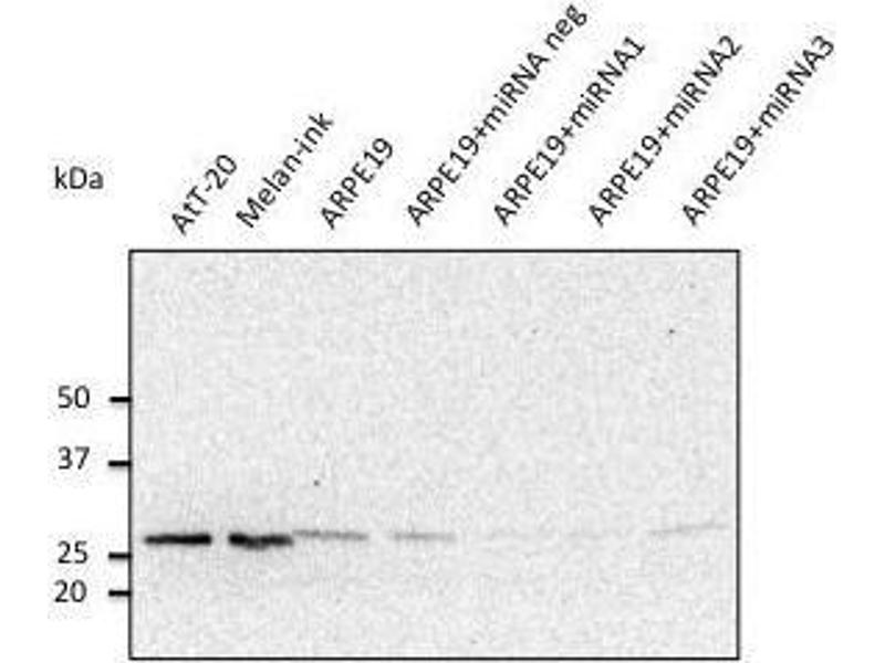 - Purified recombinant peptide derived from within residues 120 aa to the C-terminus of mouse Rab27a produced in E. coli.