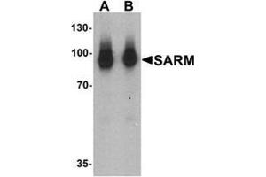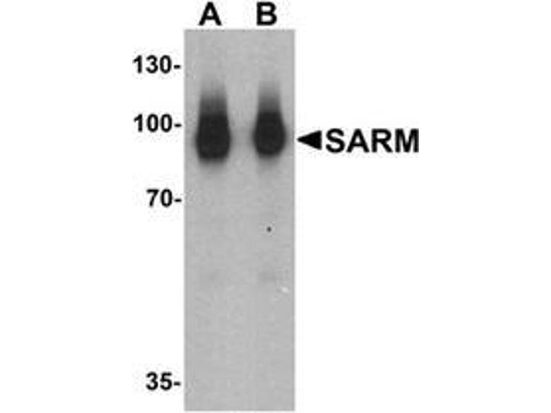 Toll-like receptors (TLRs) are signaling molecules that recognize different microbial products during infection and serve as an important link between the innate and adaptive immune responses. SARM (SAM and ARM-containing protein), along with other molecules such as TIRP, TRIF, TIRAP, and MyD88, is thought to serve as an adaptor protein for the TLRs that allows for the activation of downstream kinases and NF-kB, and ultimately the expression of proteins involved in host defense. While SARM has not been conclusively shown to associate directly with TLRs, the presence of a Toll-interleukin-1 (TIR) domain in SARM is consistent with a role as a signaling molecule.Synonyms: KIAA0524, SAM domain-containing protein 2, SAMD2, SARM, Sterile alpha and Armadillo repeat protein, Sterile alpha and TIR motif-containing protein 1, Sterile alpha motif domain-containing protein 2