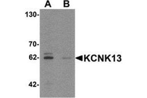 The closely related proteins KCNK13 and KCNK12 (also known as THIK1 and 2) are the first two members of a novel two pore-forming P domains K+ channels subfamily. The pore loop domain, a highly conserved region common to all potassium channels, is involved in determining potassium ion selectivity. Members of this family are all characterized by four transmembrane domains and may function to help influence the resting membrane potential of cells. KCNK13 is expressed mainly in the brain, but is also observed in kidneys. KCNK13 has been suggested to be a candidate for the Cs+-permeable K+ channel activated by GABA(B) receptors.Synonyms: KCNK13, Potassium channel subfamily K member 13, THIK-1, Tandem pore domain halothane-inhibited potassium channel 1