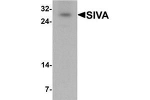 SIVA plays an important role in the apoptotic pathway induced by the CD27 antigen, a member of the tumor necrosis factor receptor (TFNR) superfamily. SIVA is a small cysteine-rich protein with a unique N-terminal amphipathic helical region, a death domain homology region (DDHR) and a C-terminal cysteine-rich B-box-like or zinc-finger-like structure. The DDHR domain binds to CD27 and induces apoptosis in T cells through a caspase-dependent mitochondrial pathway. SIVA inhibits BCL2L1 isoform Bcl-xL anti-apoptotic activity and inhibits activation of NFk-B and promotes T-cell receptor-mediated apoptosis. SIVA represents a potential therapeutic target for the treatment of neuronal cell death diseases.Synonyms: Apoptosis regulatory protein Siva, CD27-binding protein, CD27BP