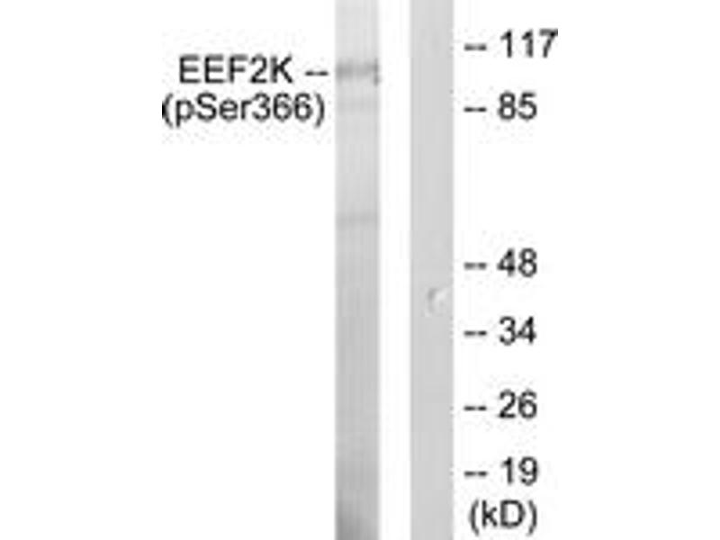 eEF2K (Phospho-Ser366) Antibody detects endogenous levels of eEF2K only when phosphorylated at Ser366.