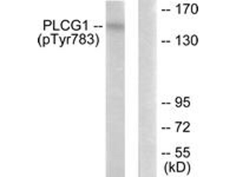 PLCG1 (Phospho-Tyr783) Antibody detects endogenous levels of PLCG1 only when phosphorylated at Tyr783.