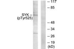 SYK (Phospho-Tyr525) Antibody detects endogenous levels of SYK only when phosphorylated at Tyr525.