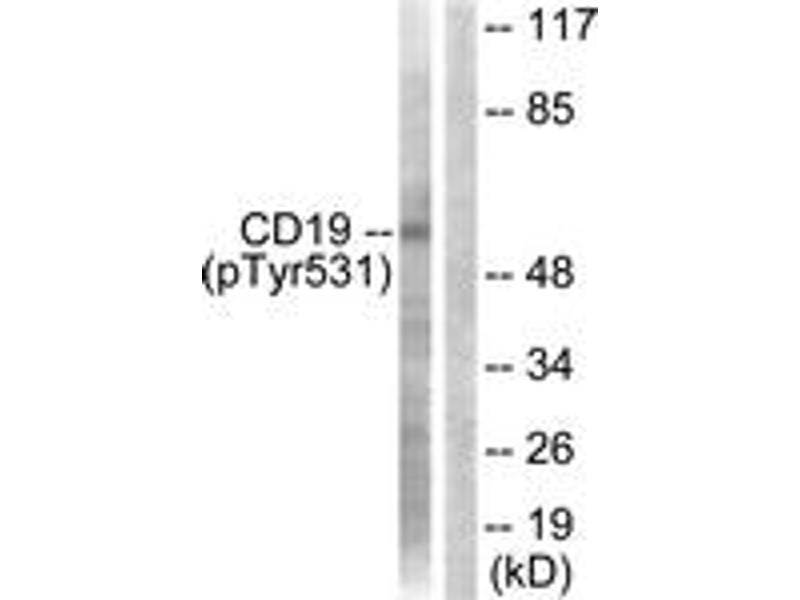 CD19 (Phospho-Tyr531) Antibody detects endogenous levels of CD19 only when phosphorylated at Tyr531.